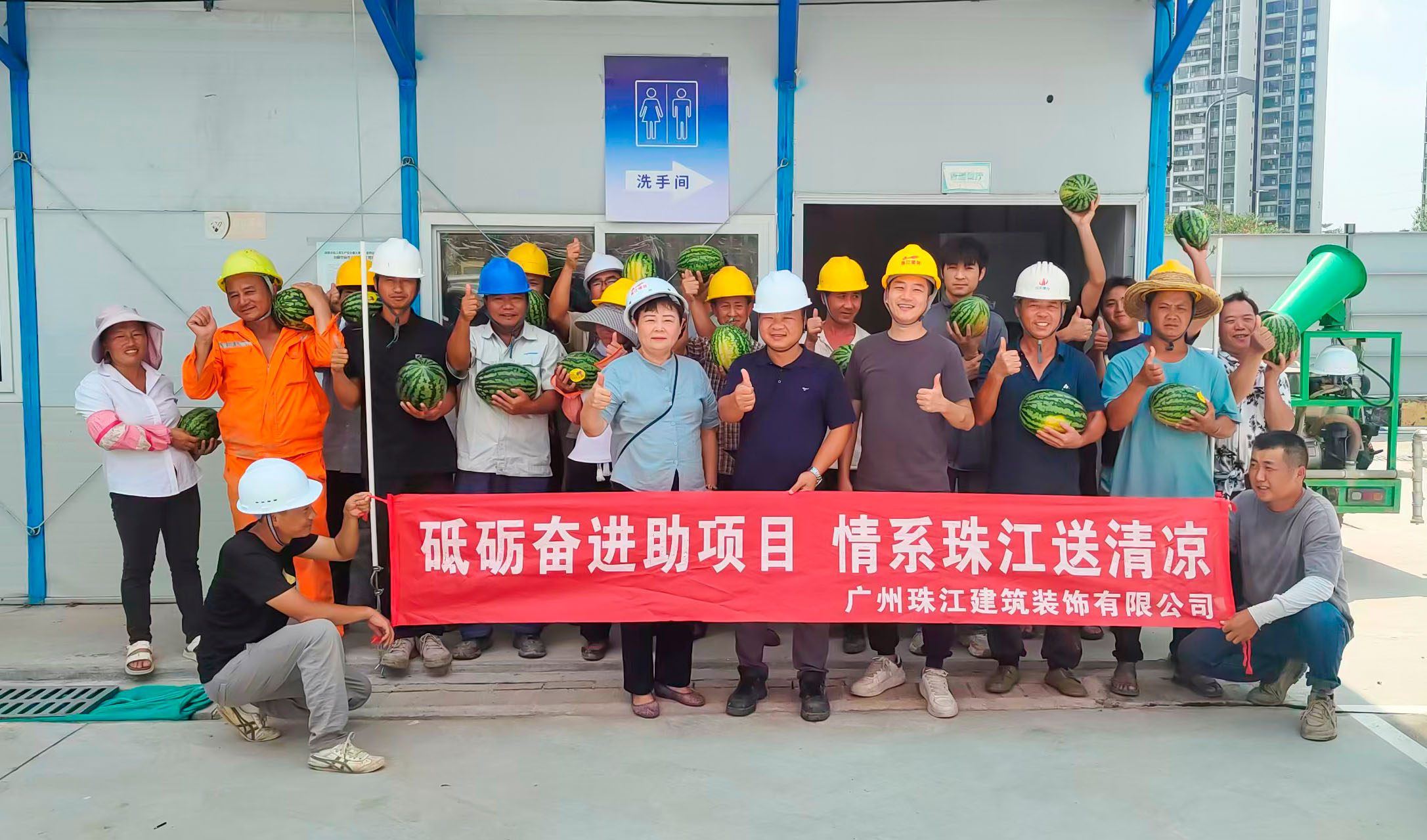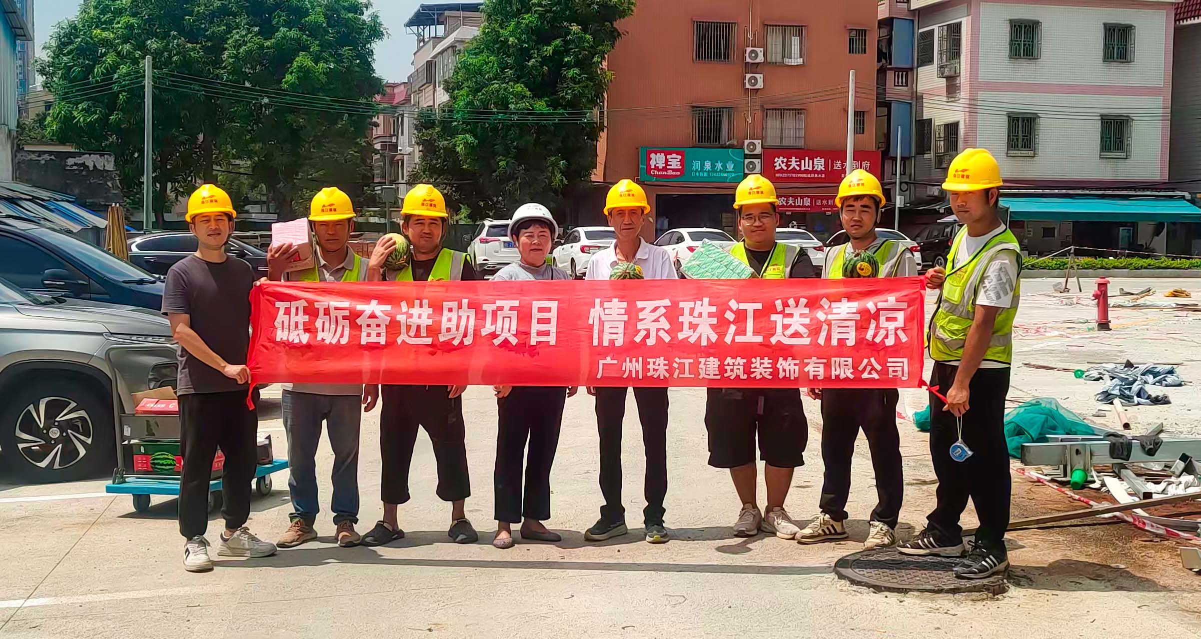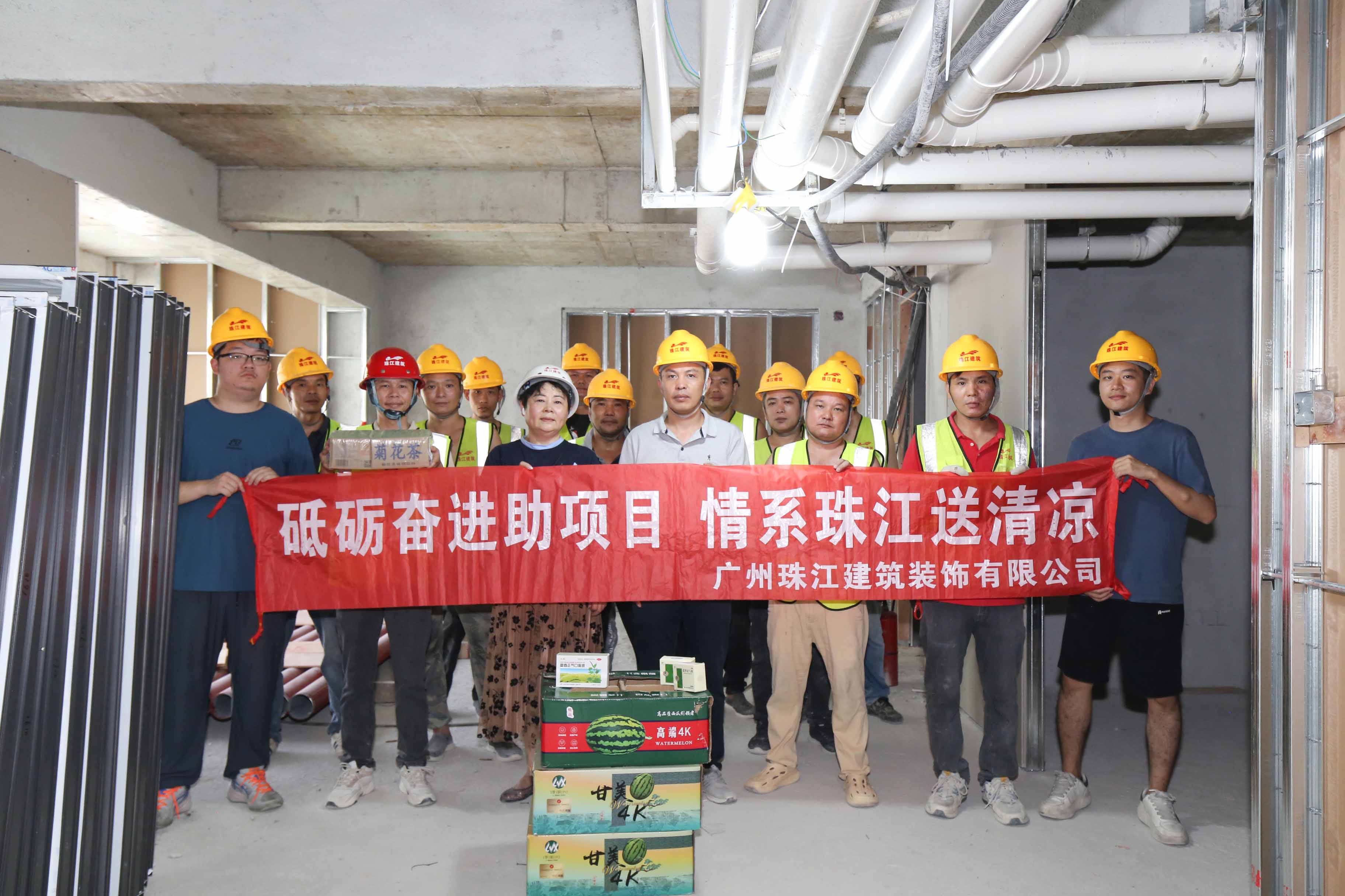 入伏以来,酷暑难耐,面对滚滚热浪,公司各在建项目的一线职工始终鏖战在钢筋水泥之间,用汗水丈量进度,用坚守诠释担当。为切实做好高温季节防暑降温工作,保障高温岗位职工健康安全,公司工会慰问组近日开展高温慰问活动,带着西瓜、藿香正气水、清凉饮品等防暑降温物资前往前往健力宝华南运营总部、乐比健康生物医药企业总部及产品研发生产基地、沙湾金寺围二期项目精装修工程、三联“新水河”地段项目外立面工程等项目。